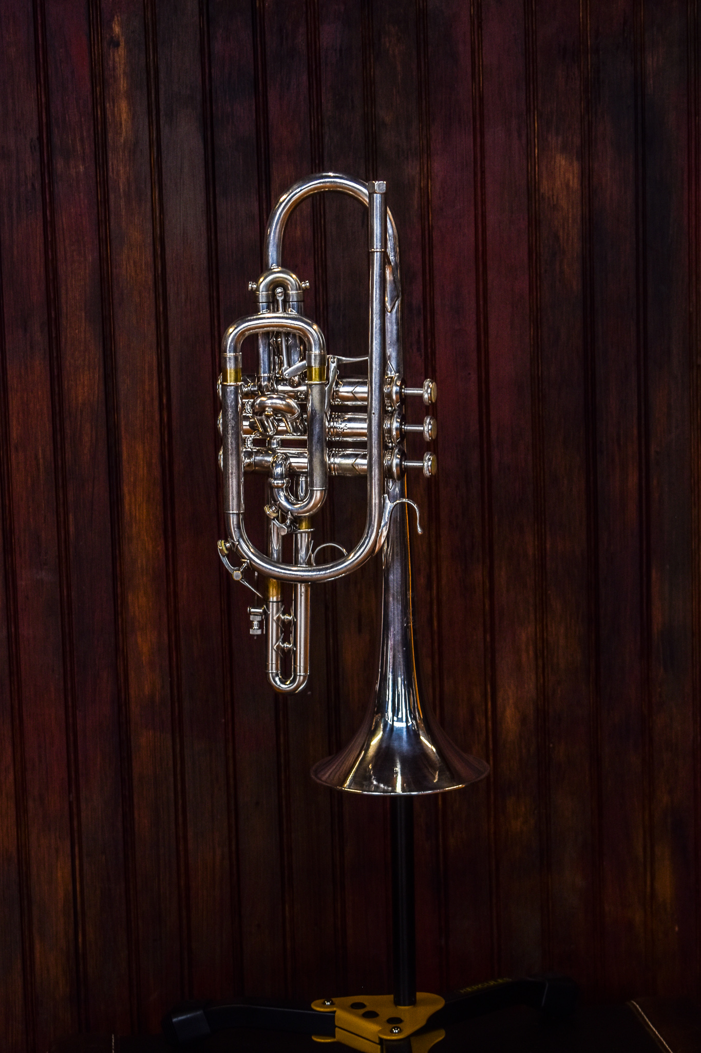 This Bach Stradivarius model cornet is a neat horn with first valve trigger and model 37 bell. It cleaned up nicely, feels good, and plays great!